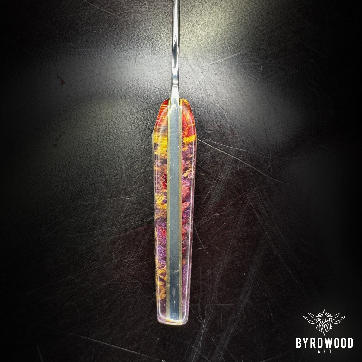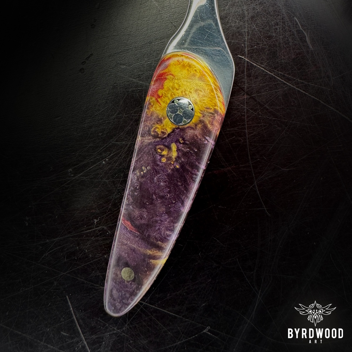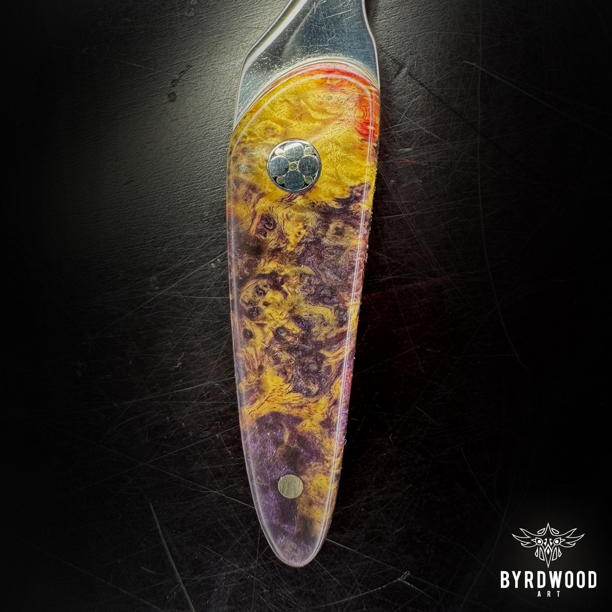 Brass liners pop under the fiery Boxelder Burl and a mosaic pin sets this one off.