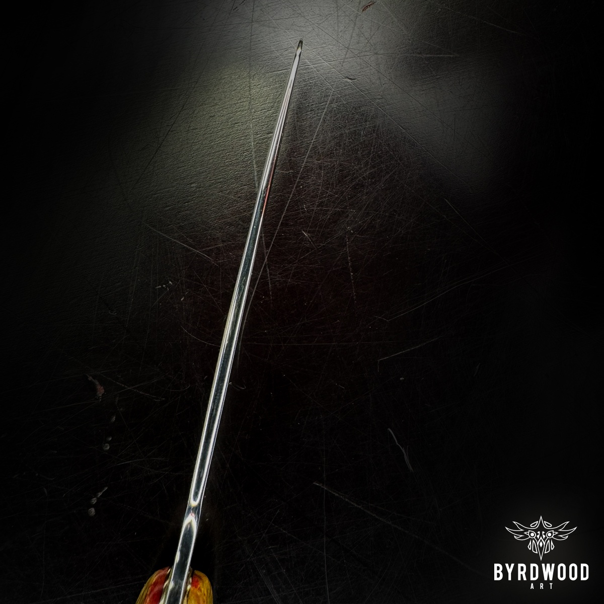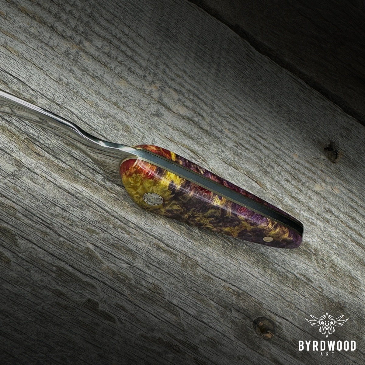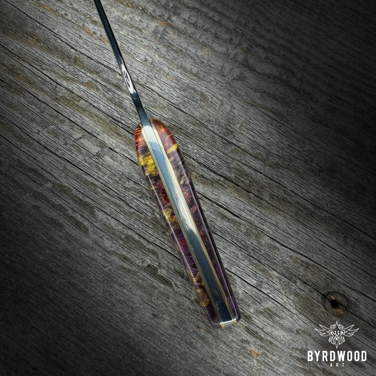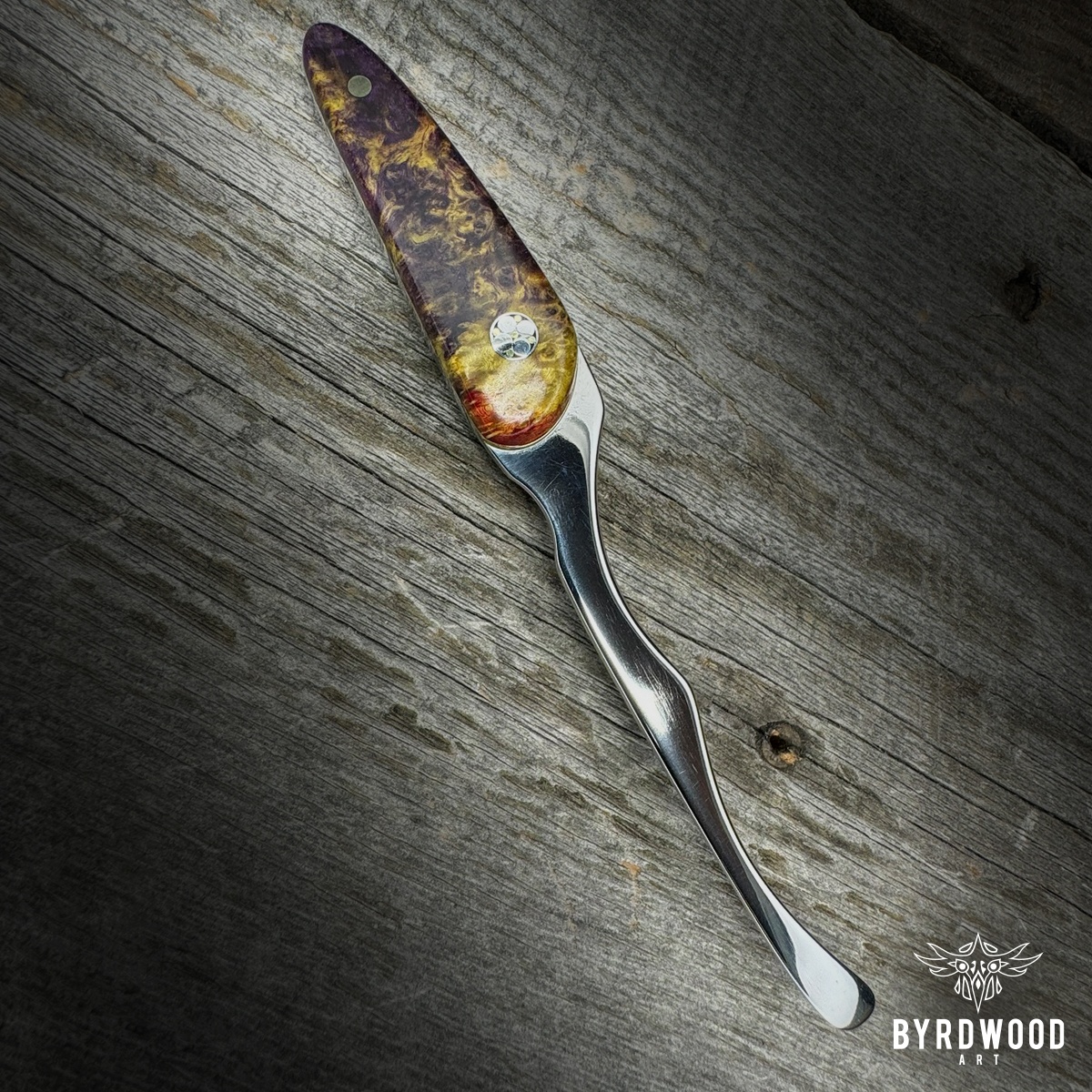 Brass liners pop under the fiery Boxelder Burl and a mosaic pin sets this one off.