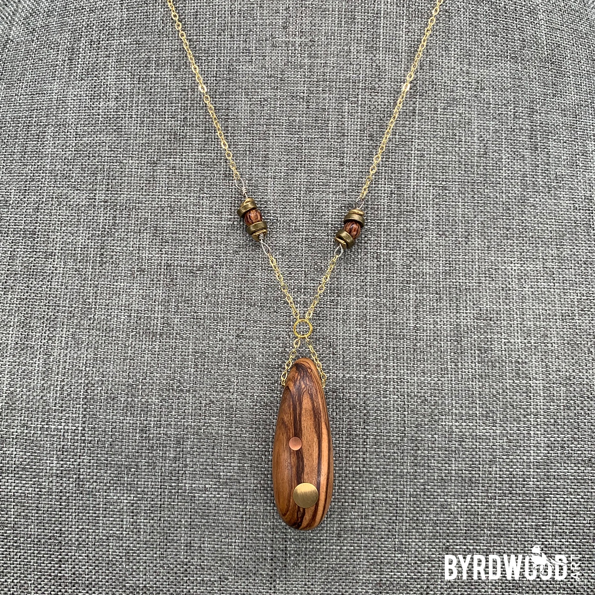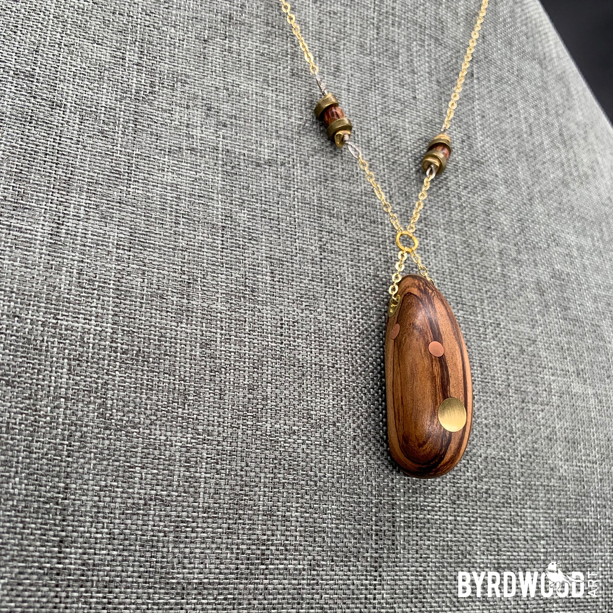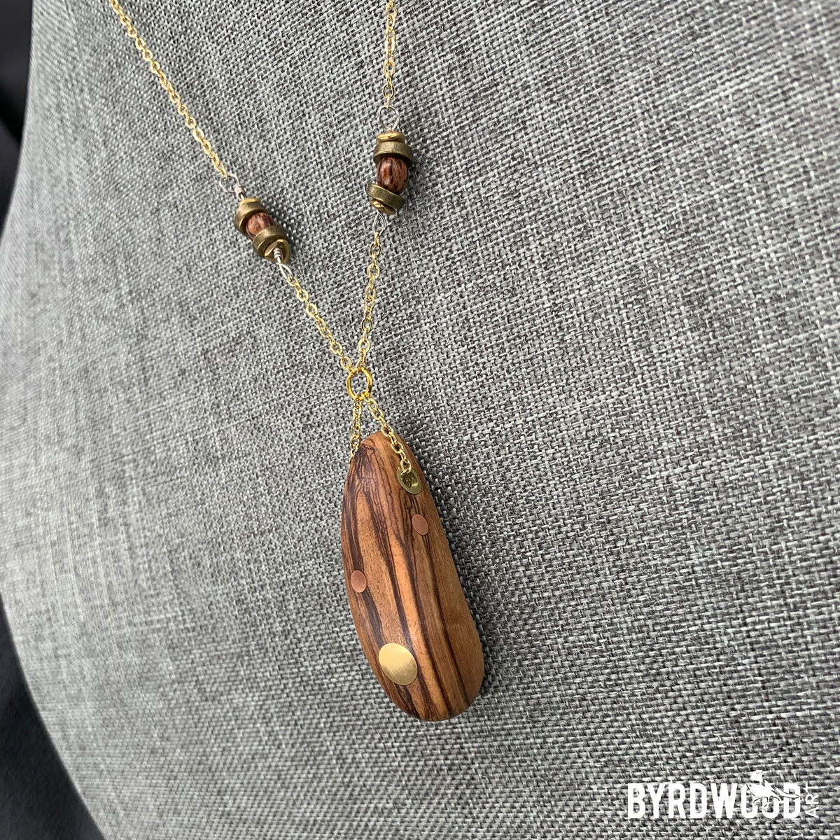 This small yet bold, ethically harvested Olivewood NEKLUS is filled with Brass, Steel, & Copper, featuring wood and brass beads, steel chain & strong magnetic clasp.
