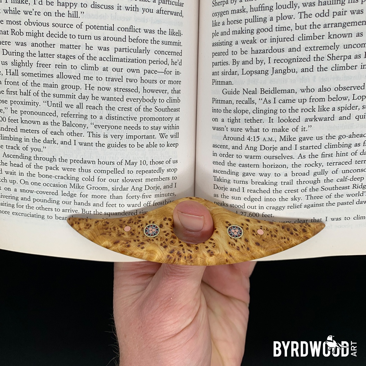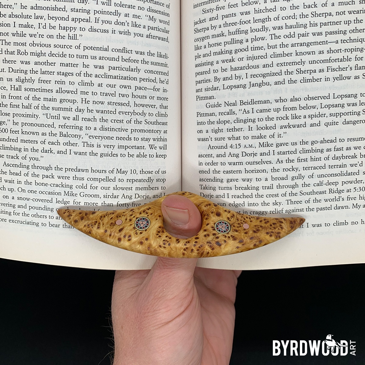 The PAGE ANCHOR is a fancy tool for comfortable, 1-handed book reading. A functional piece of art to assist the reader while holding the book in one hand, pages held open with ease.