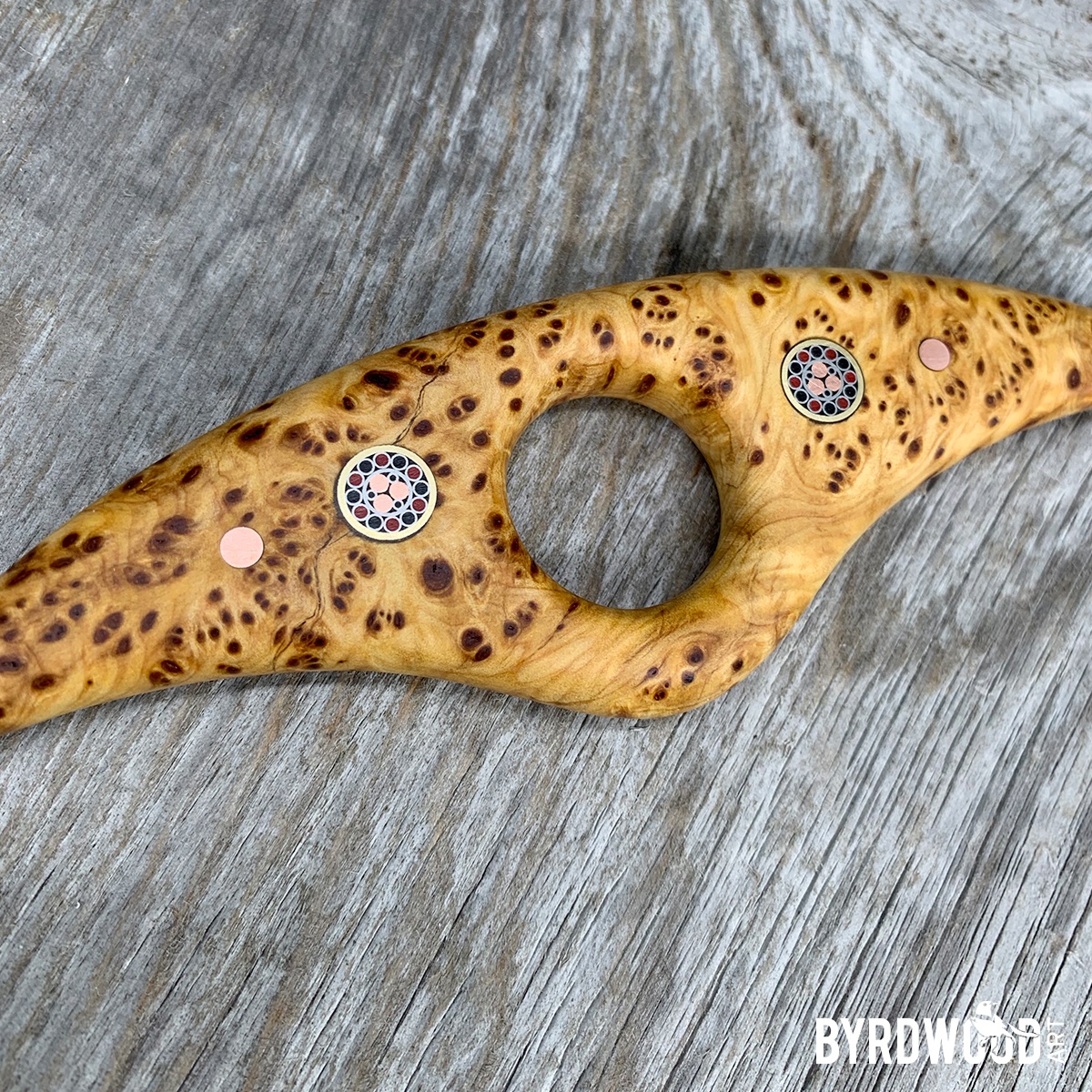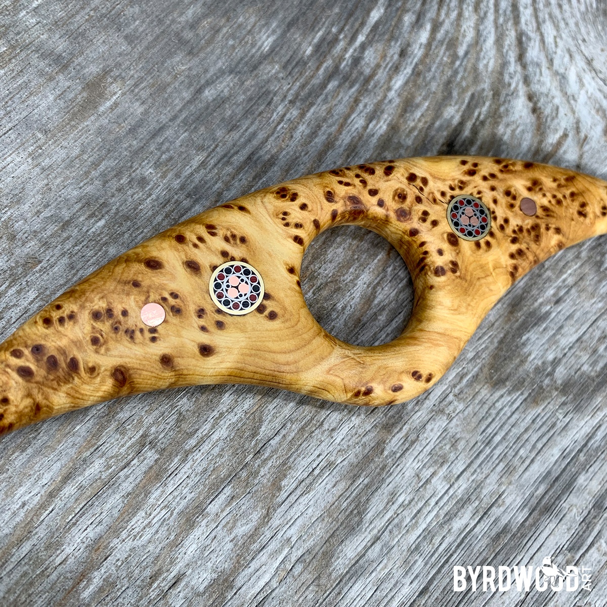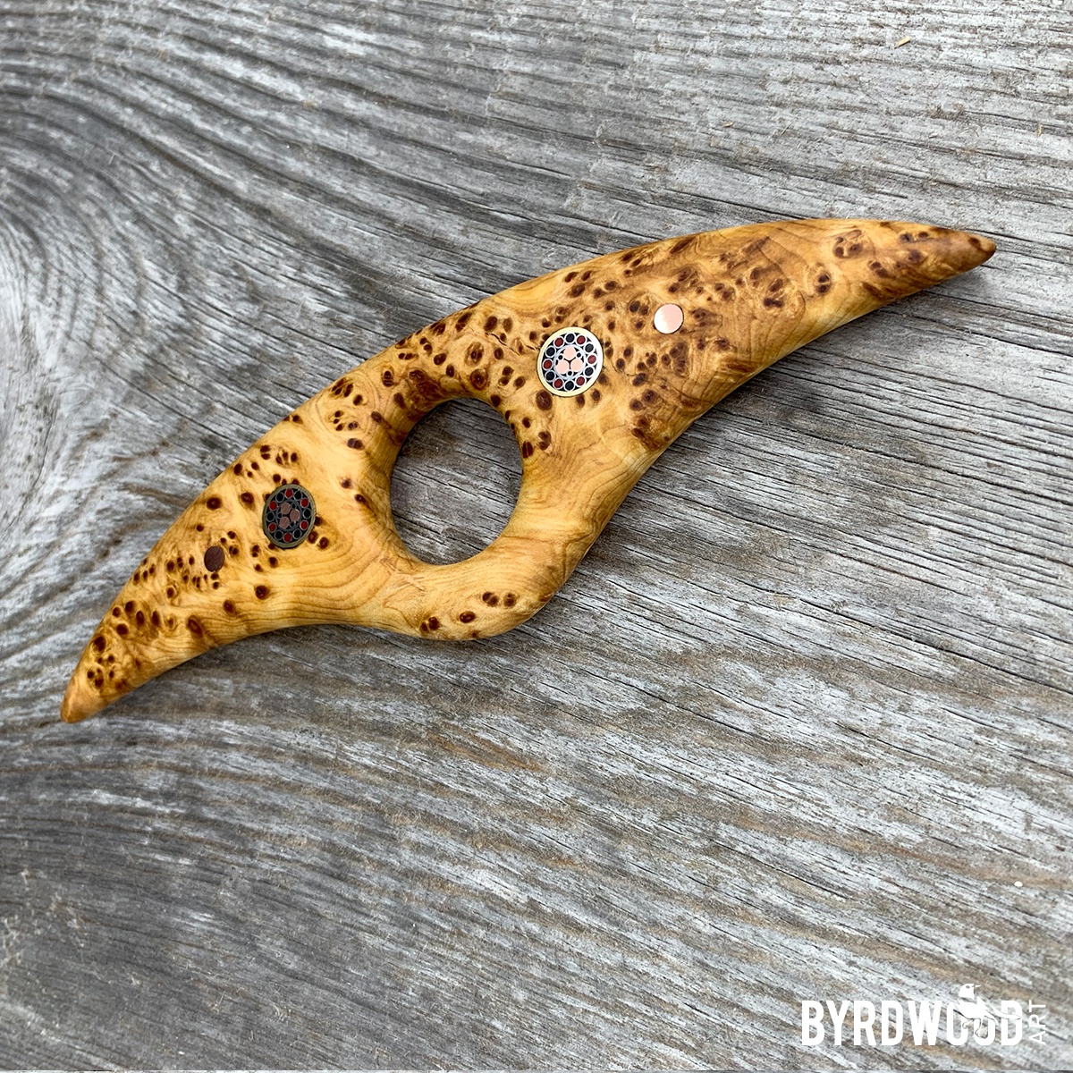 This gorgeous natural beauty of a PAGE ANCHOR is made of natural, stabilized Yellow Cedar and features the BIGGER, FANCIER mosaic pins.